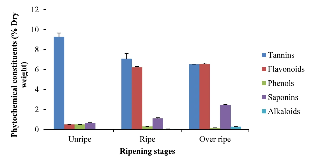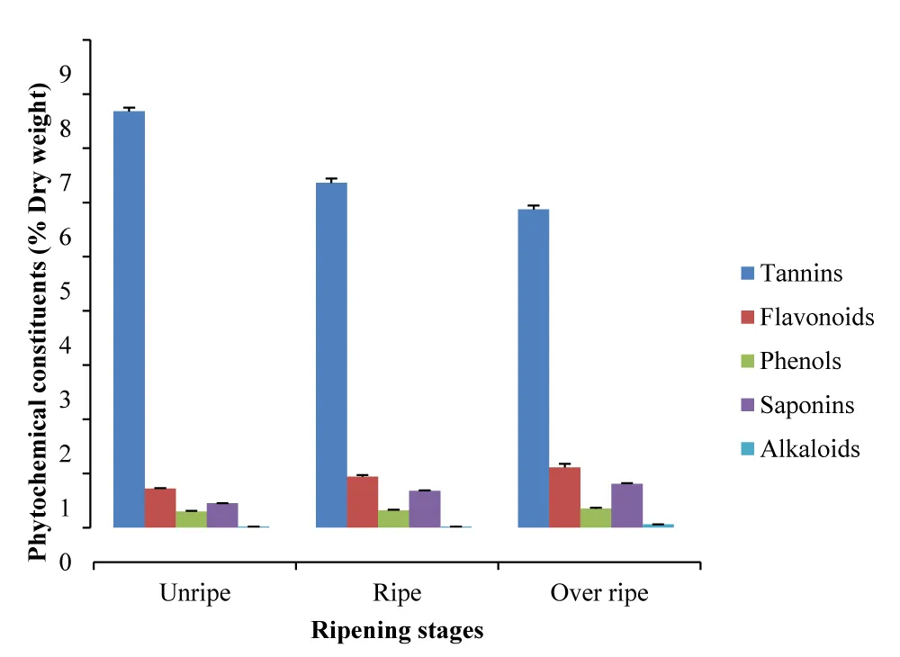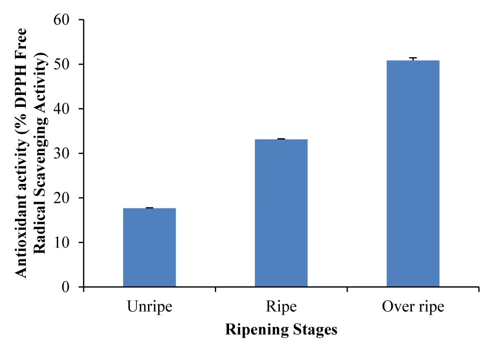 The results showed that the antioxidant activity and phytochemical constituents (% Dry weight) of Carica papaya varied with ripening stages in both cultivars (Tables 1,2). The % DPPH scavenging activity significantly increased (p < 0.01) during ripening. This suggests that ripening enhances the antioxidant properties of Carica papaya, making the overripe fruit potentially more beneficial for health in terms of antioxidant intake.