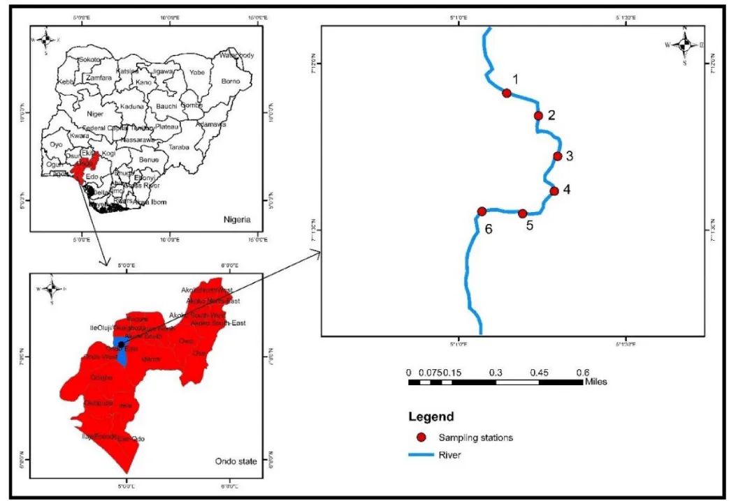 This study was conducted in the Owena River, located in the Ondo East Local Government Area of Ondo State, in the southwestern region of Nigeria (Figure 1). Sampling stations were selected along the Owena River to represent varying levels of anthropogenic influence. The selection ensured coverage of different land-use types and disturbance gradients, which provided a basis for comparative assessment of ecological status. Ondo State is situated within the tropical rainforest zone and shares boundaries with Ekiti State to the north, Kogi State to the northeast, Edo State to the east, Delta State to the southeast, Osun State to the northwest, and Ogun State to the southwest. The state lies between latitudes 5°45'N and 7°52'N and longitudes 4°20'E and 6°05'E, encompassing diverse ecological zones, including lowland rainforest, derived savanna, and riparian habitats.