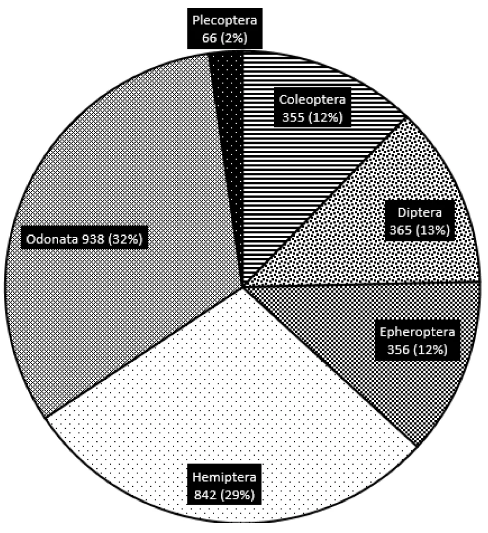 The order Odonata comprises four families: Libellulidae, Coenagrionidae, Gomphidae, and Aeshnidae. Odonata contributed 884 individuals, making up 30.28% of the total assemblage. Plecoptera was represented by Perlidae, which occurred at four stations (3 to 6), with a total of 66 individuals, comprising 2.26% of the total collection. The number of individuals per station ranged from 402 (Station 2) to 566 (Station 3). The composition and distribution of aquatic insect taxa varied across stations, indicating spatial differences in community structure along the river.