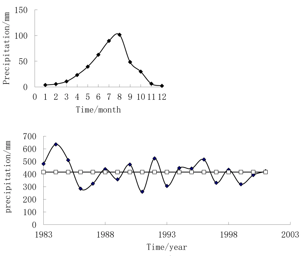 Nature resources are limit, so, Nature resources plant use in the crown and root zone is limit. The limit is resources Utilization limit by plants. Resources Utilization limit by plants includes space resource utilization limit by plants in soil water and nutrient rich regions; soil water resources utilization limit by plants in water limited regions in water limited regions and soil nutrient resources utilization limit by plants in soil nutrient limited regions. For example, in water-limited regions, along with plant growth, plant height diameter and canopy volume increase, and roots develop deep and soil water resources in the root zone reduced but available soil water resources in the crown and root zone are declined. In order to obtain maximum yield and beneficial result and carry out high quality development, even the root distribution depth is more than the maximum infiltration depth, plant roots do not absorb water indefinitely due to lack of water such as in semiarid loess hilly region (Guyuan, China) The precipitation changes with year and month, as shown in Figure 1 [2,3,6]. There should be a control limit for the utilization of soil water resources