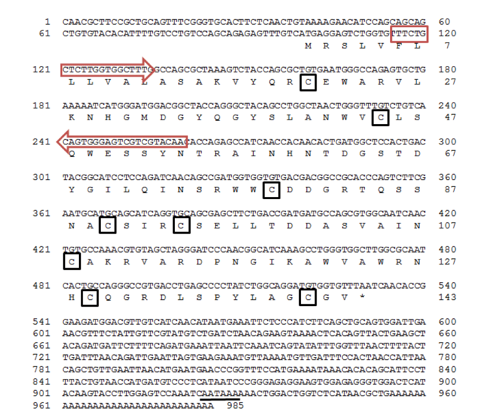 The full-length RbLysC cDNA was 985 bp long and contained an open reading frame (ORF) of 432 bp that encoded 143 amino acid (aa) residues, the 5'-untranslated region (UTR) of 120 bp and the 3'-UTR of 444 bp. Signal peptide was not found in the terminal and flanking active aspartate region (64-73aa) are conserved in RbLysC, and a polyadenylation signal (AATAAA) and poly A-tail are present in the 3'-UTR of RbLysC (Figure 1).