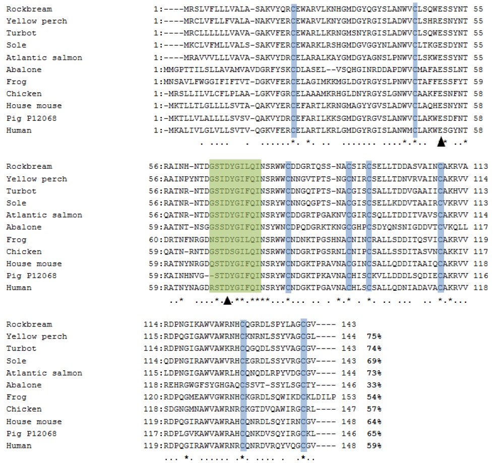 Indicated that the deduced amino acid sequences of RbLysC shared significant identity with other reported lysozyme C. RbLysC presented 75% identity with Yellow perch (Perca flavescens FJ804424.1), 74% with Turbot (Psetta maxima EU747734.1), 73% with Atlantic salmon (Salmo salar BT047934.1), 69% with Sole (Solea solea DQ293993.1), 65% with Pig (Sus scrofa domesticus P12068), 64% with House mouse (mus musculusP08905), 59% with Human (Homo sapiens P61626.gnu), 57% with Chicken (Gallus gallus FJ542389.1), 54% with Frog (Leiopelma archeyi XM_002938507.1) and 33% with Abalone (Haliotis discus HM068601.1) (Figure 2).