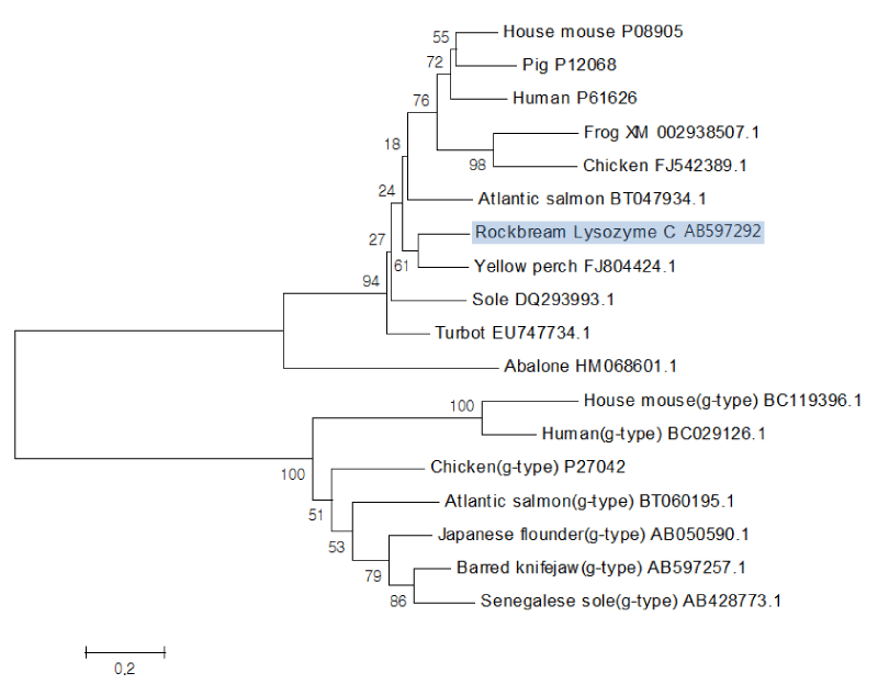 In an attack experiment, the expression patterns of c-type and of g-type were reported to be very different from each other. In the Brill, the c-type were not detected in all tissues nine hours after the infection by the Vibrio angularium. On the contrary, the g-type lysozymes were the most predominantly identified in spleen and liver [14]. This result implies that the g-type and c-type evolved to acquire differentiated functions of bacteriolytic action and digestion. Therefore, attack experiments are to be conducted to clearly determine the functions of lysozymes in Oplegnathus fasciatus.
