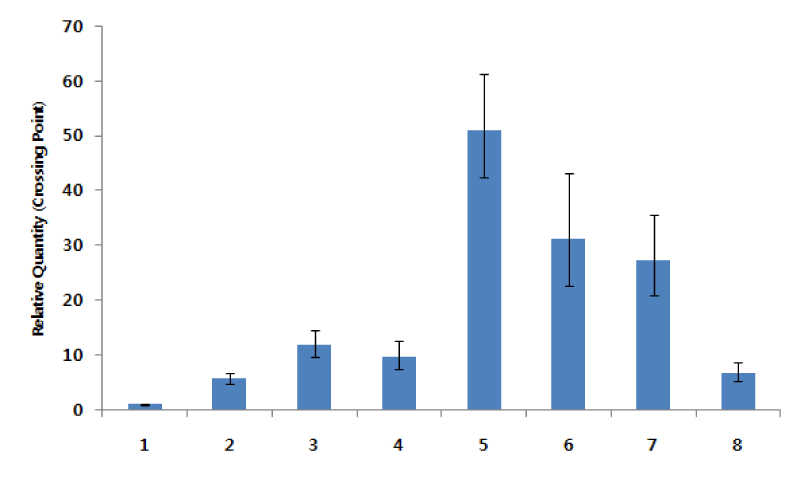The tissue distribution pattern of RBgLyz mRNA transcripts was determined by Quantitative real-time PCR of PBLs, head kidney, trunk kidney, spleen, liver, intestine, gill and muscle of healthy individuals (Figure 4). The expression level for each of the tissues examined was normalized to that of β-actin. Relative expression fold differences were calculated based on the expression in PBLs to determine the tissue expression profile. RbLysC gene expression was ubiquitous in all tissues tested. The highest RbLysC gene expression was observed in the liver, which was about 50-fold relative to that of the PBLs. RbLysC was highly expressed in the intestine (about 30-fold), gill, trunk kidney, spleen, muscle and head kidney relative to that of the PBLs.