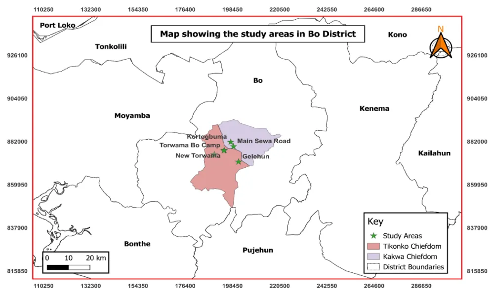 Bo is the capital of the Southern Province and the second-biggest city in Sierra Leone. According to Statistics Sierra Leone, the 2021 Mid-Term Population and Housing Census conducted, there are 223,075 people living in Sierra Leone’s commercial center. The land area of Bo city is approximately 25 Sq. km. Bo is a major urban center situated about 160 miles (250 km) east-southeast of Freetown. The city is distinguished by its wide ethnic composition, which is mostly home to the Mende people. The climate of the Bo district is like any other place in the south: it comprises two main seasons, dry and rainy seasons. The dry season is characterized by the harmattan, a hot, dry wind that blows from the Sahara, and relative humidity may be as high as 90% for considerable periods. It also experiences an upper temperature of 70 °F (mid-20 °C) and a low temperature of about 27 °C in low-lying coastal areas. The study was carried out at the Fisheries outstation in Kotogbuma, Agro Fish Farm in New Town Torwama, Gelehun, Main Sewa Road, and Torwama Bo Campus fisheries pond, all in Bo District, Southern Sierra Leone. The study targeted fish farmers who are actively involved in fish farming. The study area is illustrated in Figure 1 below.