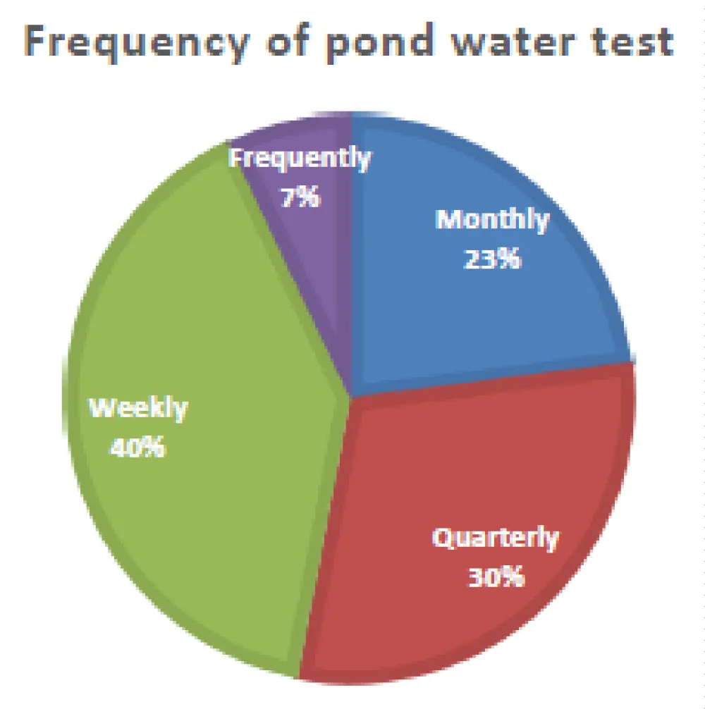 Based on the results provided above, 40% of respondents indicated that the pond water tests are conducted weekly (Figure 2). On one hand, 23% of the respondents stated that the pond water tests are conducted monthly, while 7% of the respondents test water frequently. However, 30% of the respondents indicated that the pond water tests are conducted quarterly. This reflects the different monitoring schedules for how the tests are done. This implies that pond water needs regular testing for better pond productivity.