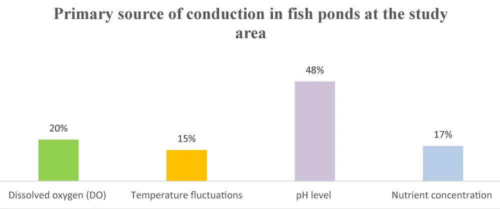 The results above represent the primary source of conduction in the pond, with 48% of the respondents indicating the pH level (Figure 3). In addition, 15% of the respondents stated that temperature fluctuation impacts pond condition. Furthermore, 20% of the respondents indicated that dissolved oxygen is another major condition in the fish ponds. However, 17% of respondents noted that nutrient concentration in the pond contributed immensely to the growth of the fish in the ponds. These results show that pH and dissolved oxygen are critical for conduction in any fish pond management.