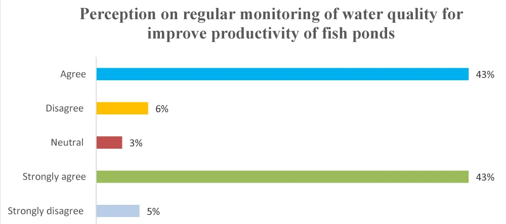 According to the result above, 43% of the respondents agree and strongly agree, respectively, that regular monitoring of water quality is crucial for maintaining productivity in the fishpond (Figure 4). However, 5% of the respondents disagree with regular water quality monitoring. This shows that 86% of respondents strongly agree and consider regular water quality monitoring as vital for maintaining fish pond productivity. The results imply that regular monitoring is crucial for two reasons: water quality improvement and pond productivity.