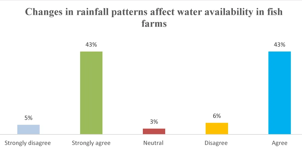 The data above revealed that 43% of the respondents pointed out that changes in rainfall patterns significantly affect water availability in the fish farm (Figure 5). The (5%) of the respondents strongly agree that rainfall variability significantly impacts water availability in fish ponds. The result. Results demonstrate that changes in precipitation patterns affect both the quality and productivity of pond water, including availability.