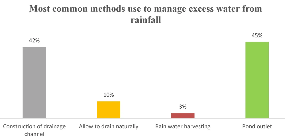 According to the results above, 45% of respondents considered the pond outlet the most appropriate method for managing excess pond water (Figure 6). In addition, 10% of the respondents noted that allowing water to drain naturally through the channels is the best common approach to use. However, 43% of the respondents indicated they constructed a drainage channel for the pond water so that the excess water drains through the pond outlet. The findings imply that the discharge of toxic water through the drainage system is fundamental for the effective performance of any fish pond.