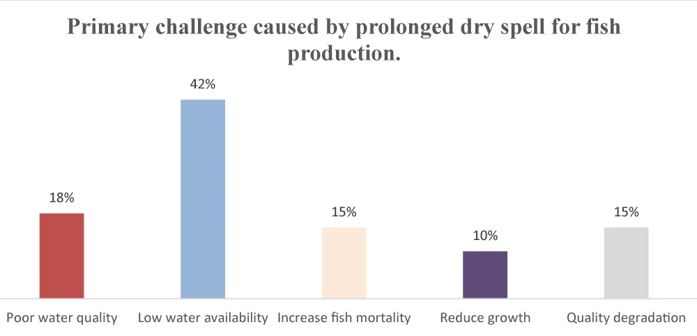 According to the results, 42% of the respondents indicated that low water availability is the most significant challenge caused by prolonged dry spells for fish production in the study area (Figure 7). In addition, 18% of the respondents stated that poor water quality is another primary challenge affected by prolonged dry spells, whereas 15% of the respondents pointed out that prolonged dry spells lead to an increase in fish mortality. Note that 15% of the respondents indicated quality degradation as one of the primary challenges. The findings imply that as the dry season prolongs, water in the pond becomes toxic and leads to the death of fish.