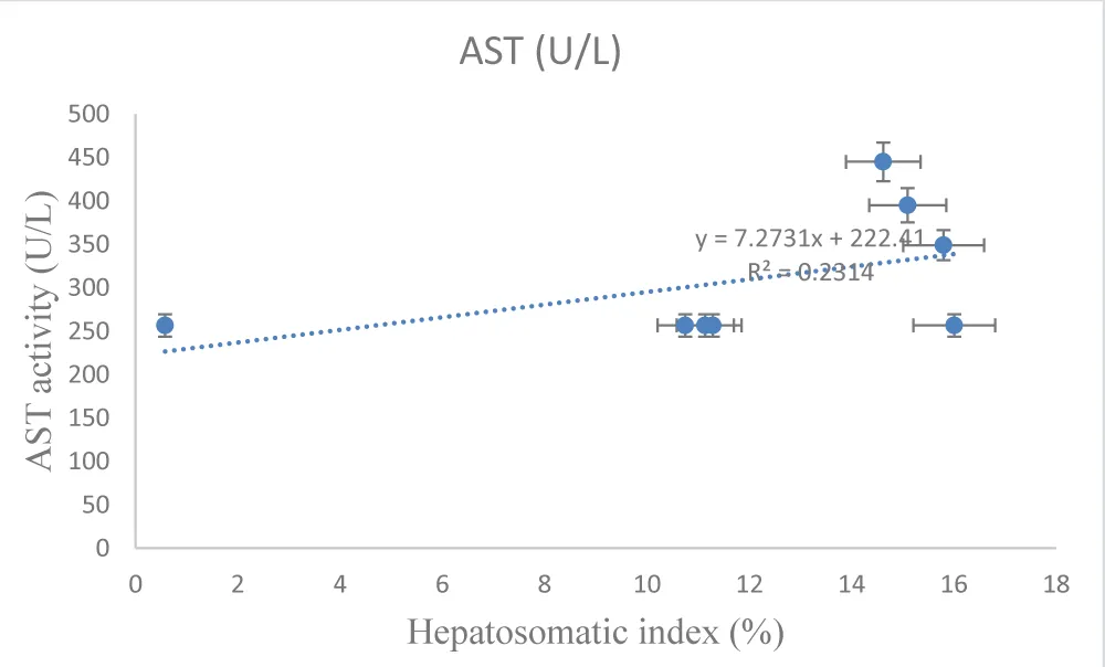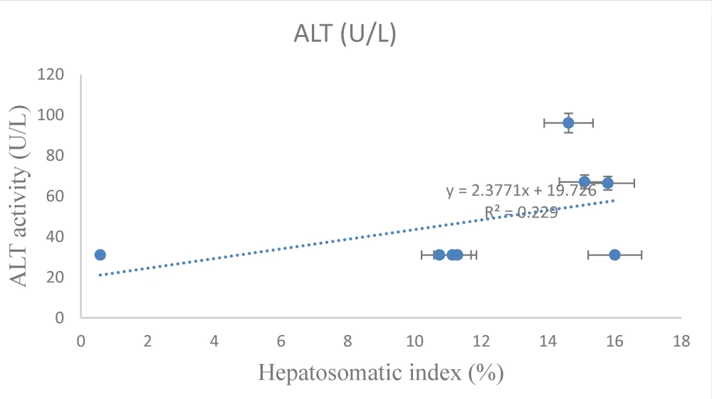 The liver plays a central role in xenobiotic metabolism and detoxification in fish, functioning as the primary site for biotransformation of chemical contaminants into less toxic and more readily excretable metabolites. Owing to this role, hepatic tissues are widely used as sensitive biomarkers for assessing pollutant-induced stress in aquatic organisms [13,16]. The hepatosomatic index (HSI), which represents the ratio of liver weight to total body weight, provides an integrated measure of hepatic response to environmental stressors and toxicants [12,19].