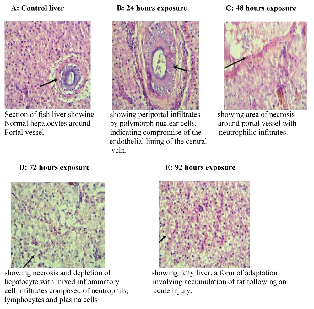 Histopathological examination further corroborated the adverse effects of the herbicide on hepatic integrity. Liver sections from control fish displayed normal architecture, with well-organized hepatocytes surrounding the portal vessels. In contrast, exposed fish exhibited progressive pathological alterations with increasing exposure duration. After 24 hours, periportal infiltration by polymorphonuclear cells was evident, suggesting early inflammatory responses and endothelial compromise. At 48 hours, focal necrosis around portal areas accompanied by neutrophilic infiltration was observed, indicating hepatocellular damage. The 72-hour exposure group showed extensive necrosis, hepatocyte depletion, and mixed inflammatory cell infiltration, reflecting advanced tissue injury. By 96 hours, the liver architecture was characterized by sheets of hepatocytes with clear cytoplasm and thin fibrous stroma, consistent with hepatic steatosis (fatty liver), a known adaptive response to acute toxic insult involving lipid accumulation due to impaired lipid metabolism.
